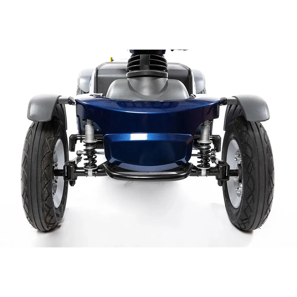 Der hochwertige Komfortsitz des Excel Deluxe ist drehbar, höhenverstellbar, sitztiefenverstellbar und mit gepolsterten Armlehnen ausgestattet – ideal für längeres Verweilen auf dem Elektrogerät. Das vollgefederte Fahrwerk sorgt in Kombination mit robusten Rädern für sanfte Fahrt bei jedem Untergrund. So wird selbst unebener Asphalt zur entspannten Strecke, auf der Sie sich wohlfühlen.