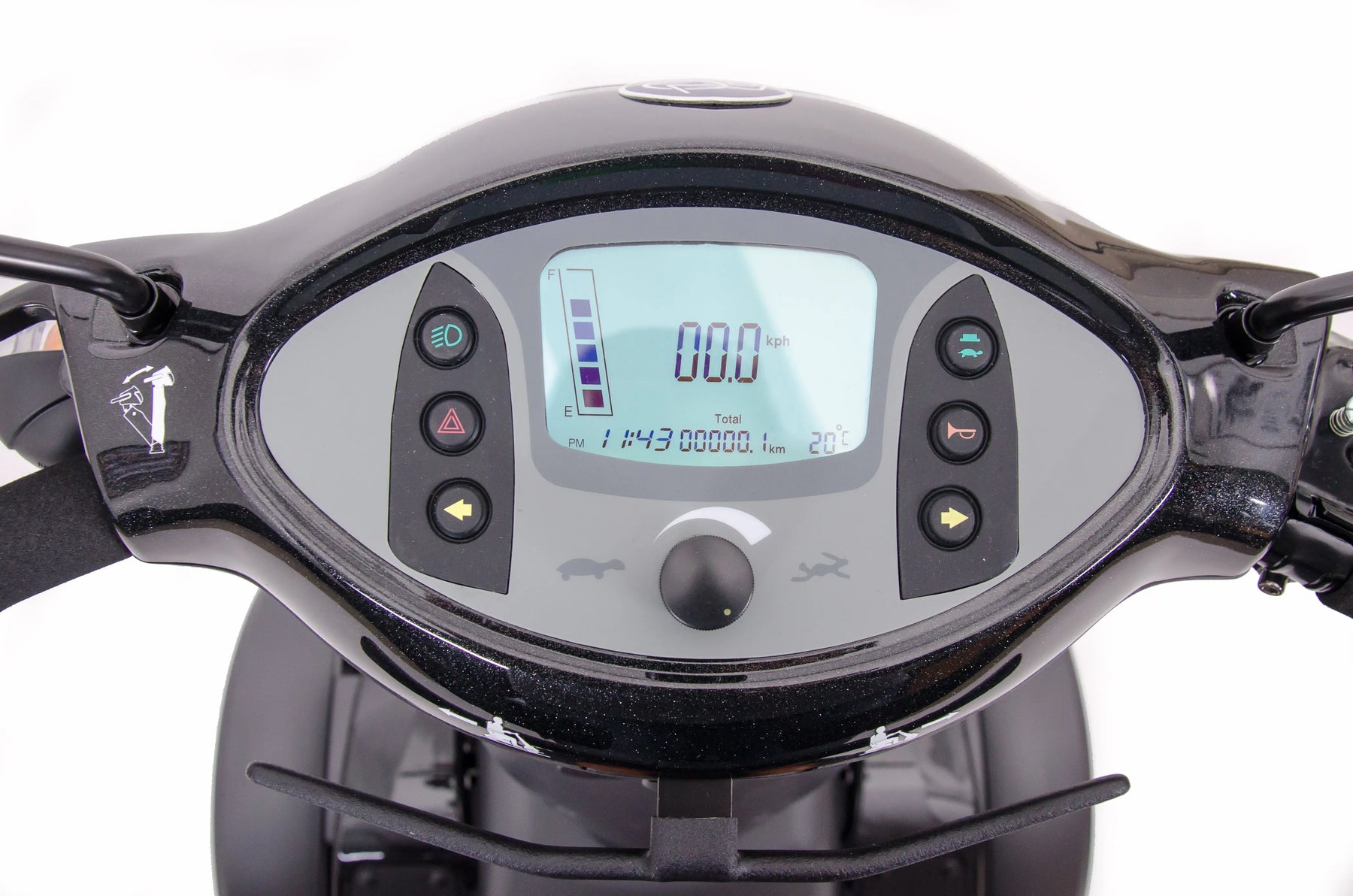 Ausgestattet mit kräftiger LED-Beleuchtung vorn und hinten, Reflektoren und einer zuverlässigen elektromagnetischen Bremse verfügt der Deluxe über Technik, die sichtbar macht, wie sicher Mobilität sein kann. Große Rückspiegel bieten perfekte Übersicht, auch bei engen oder verkehrsreichen Stellen.