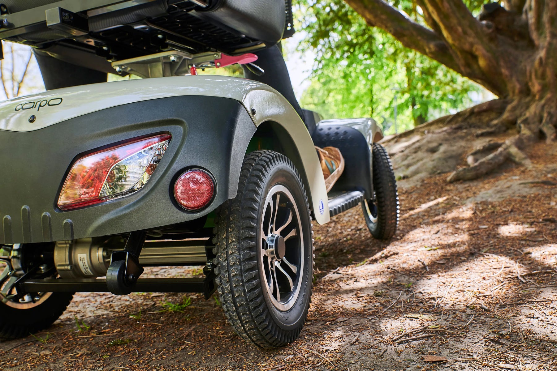 Hergestellt in Europa vereint der Carpo 2 SE traditionelle Qualität mit modernster Technologie. Das Stoßdämpfersystem in Kombination mit den aufblasbaren Rädern garantiert ein komfortables Fahrgefühl auf jedem Untergrund, während der leistungsstarke Motor selbst anspruchsvolle Strecken mühelos meistert. Diese besondere Kombination aus Robustheit und Eleganz macht den Carpo 2 SE zu einem echten Unikat unter den Elektromobilen.