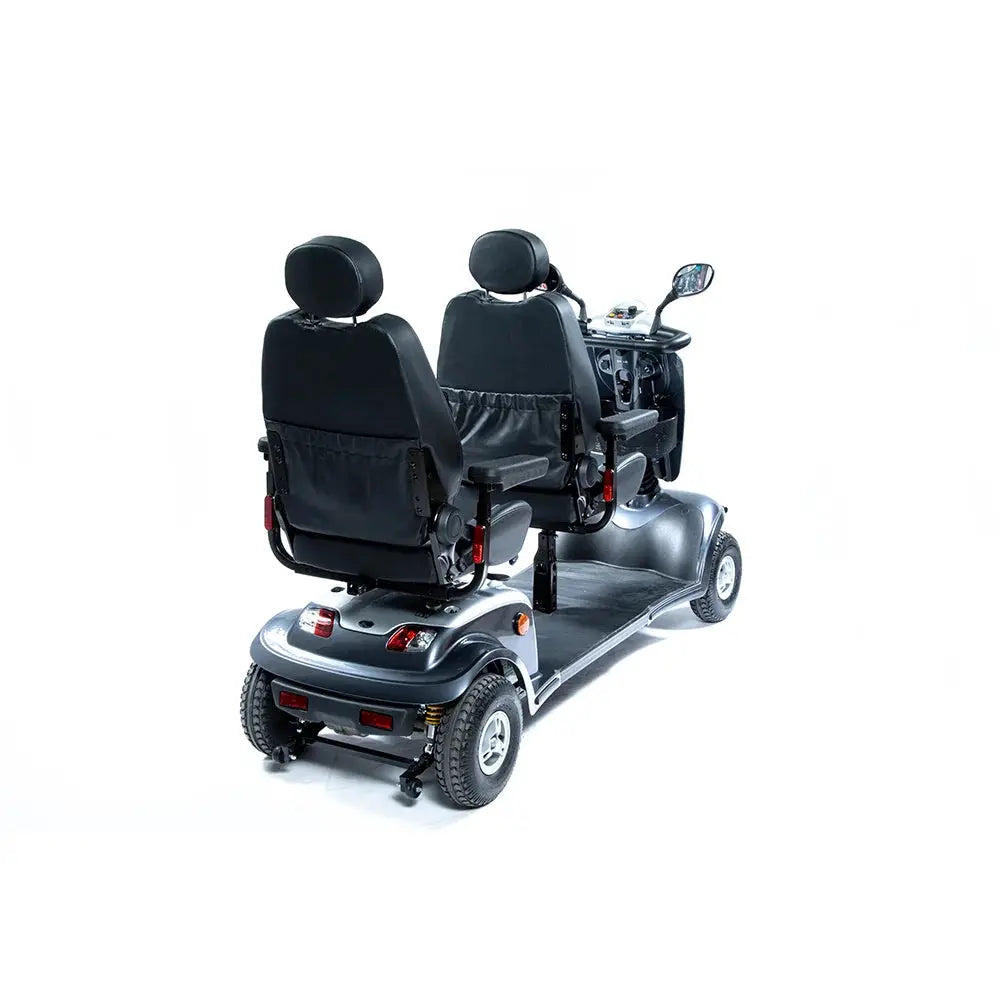 Zwei orthopädisch gepolsterte Sitze mit höhenverstellbarer Rückenlehne bieten individuelle Passform und Komfort. Armlehnen an beiden Seiten lassen sich klappen – besonders praktisch beim Ein- und Aussteigen. Das komplett gefederte Chassis sorgt in Kombination mit robusten Rädern für entspannte Fahrten – auch auf leicht unebenem Gelände.