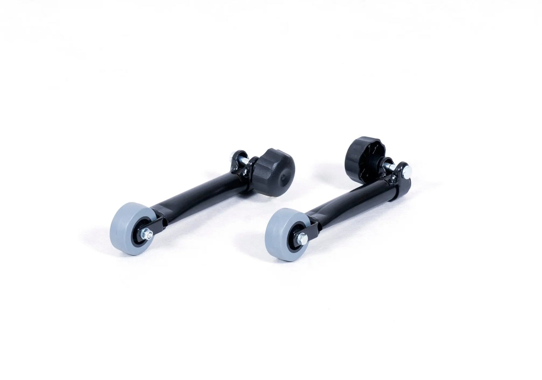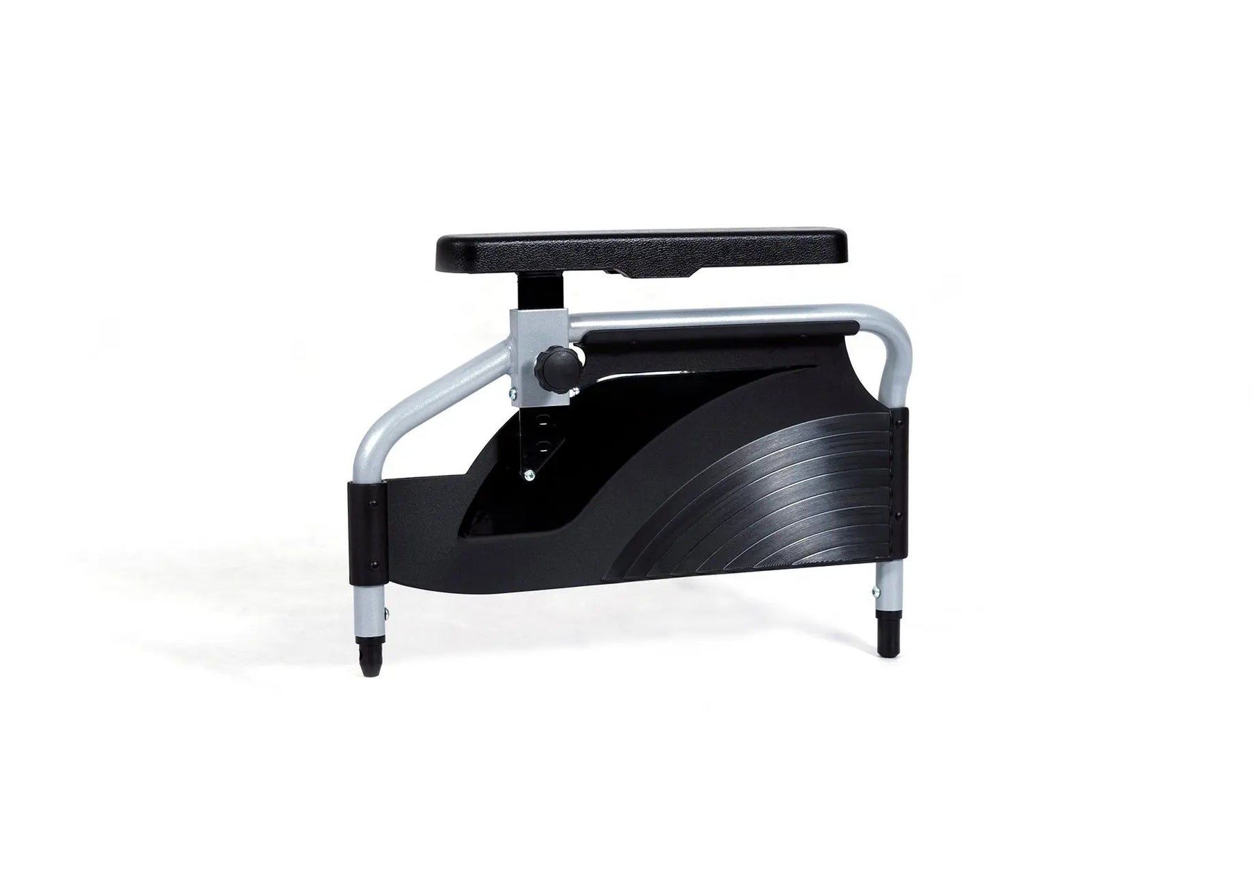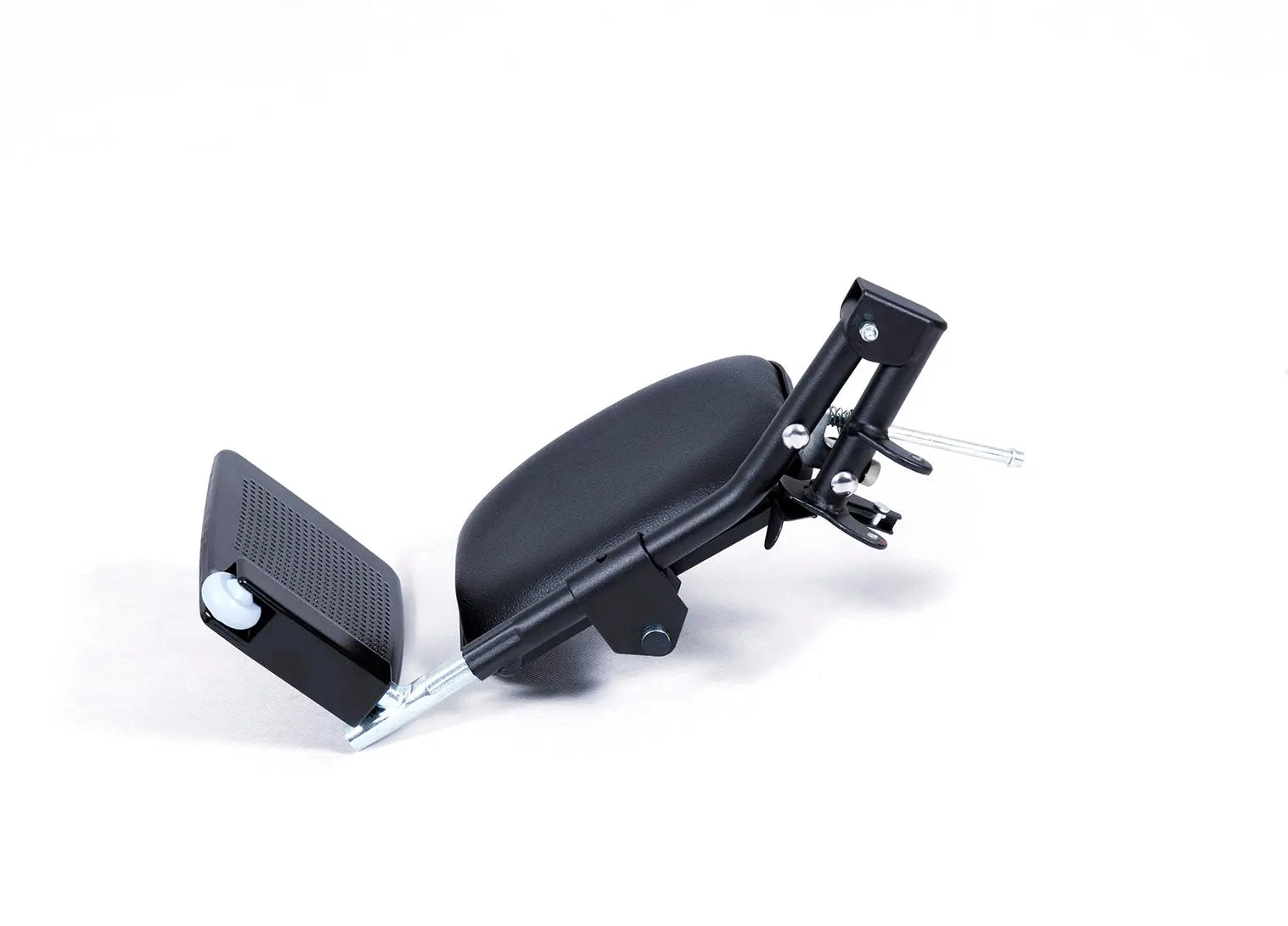 Die gepolsterten, abschwenkbaren Armlehnen (in Lang- oder Desk-Variante) ermöglichen einen bequemen Seiteneinstieg oder das Heranfahren an Tische. Beinstützen lassen sich abklappen oder abnehmen – für Transfers, Lagerung und individuelle Positionierung. An den Fußplatten schützen Abweisrollen Möbel und Wände; ein Wadenband gibt zusätzliche Stabilität im Alltag.