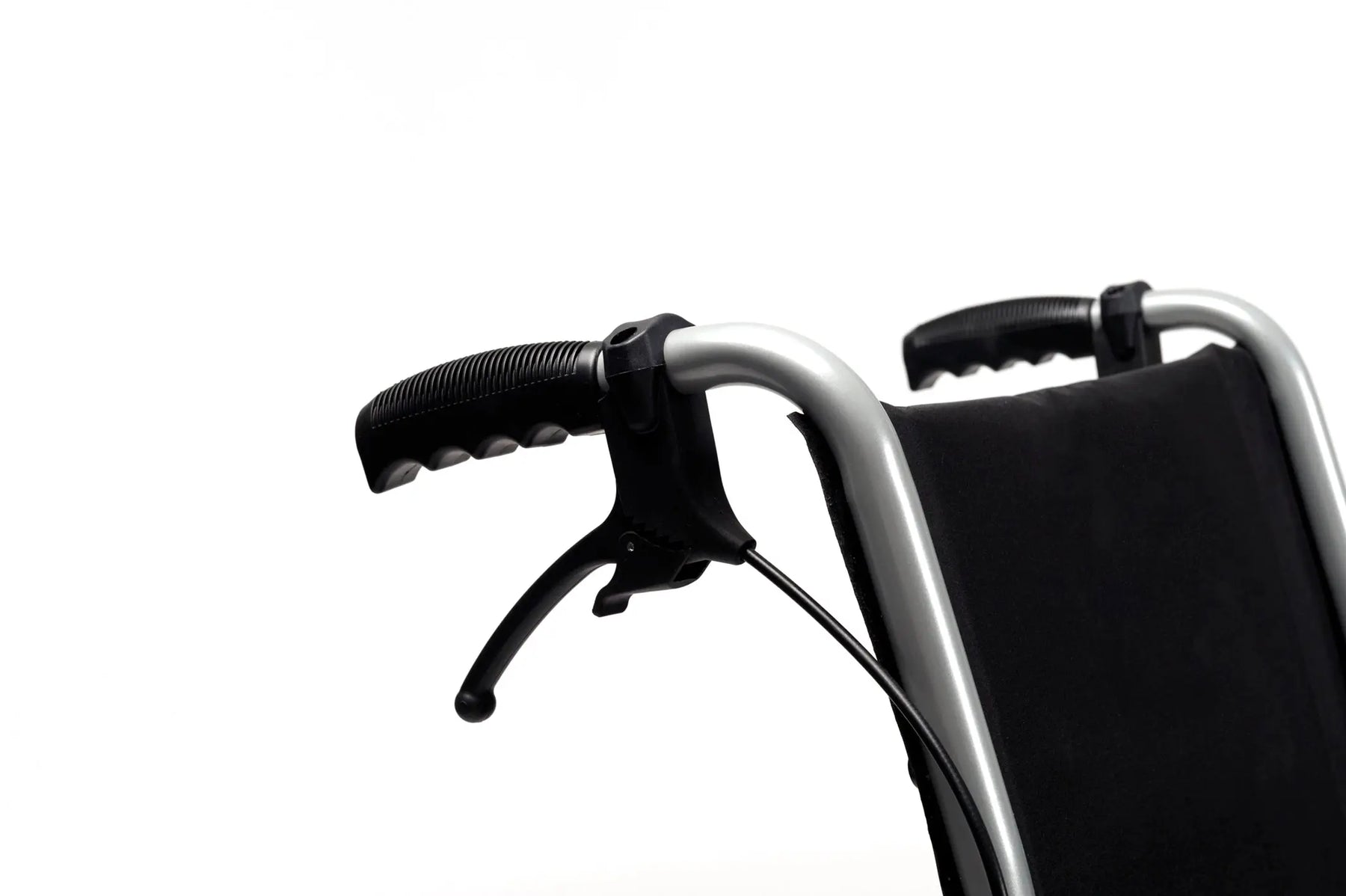 Die pannensichere PU-Bereifung sorgt für sorgenfreies Fahren – ohne Luft nachpumpen, ohne unerwartete Standzeiten. Eine leichtgängige Feststellbremse auf Federsystem-Basis vermittelt Halt beim Sitzen, Umsetzen und Parken. Schiebegriffe unterstützen Begleitpersonen bei längeren Strecken oder Steigungen.