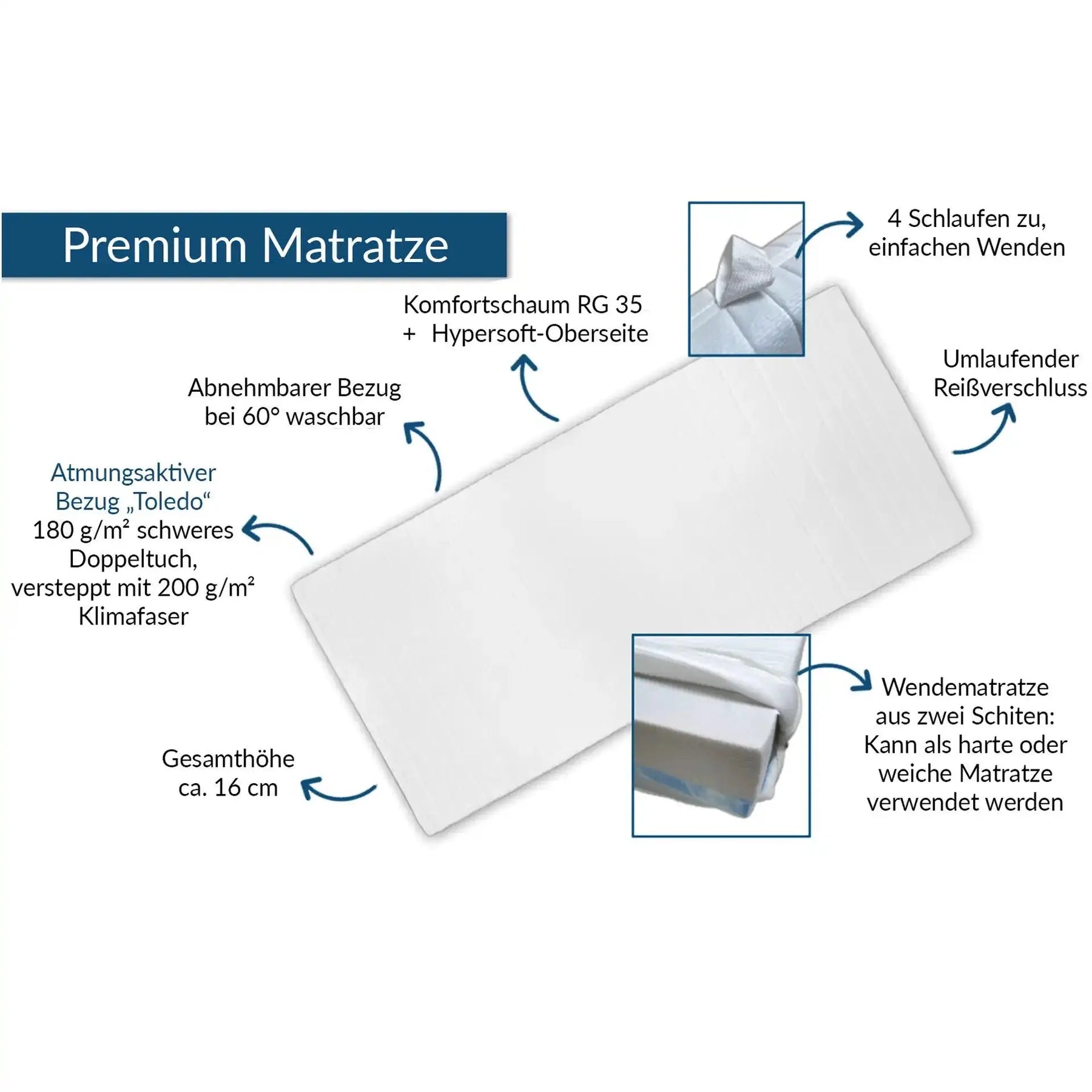 Die Matratze besteht aus einem 16 cm hohen Komfortschaum (RG 35), der sich optimal an die Körperkonturen anpasst. Diese Eigenschaft ermöglicht eine ideale Unterstützung der Wirbelsäule, indem schwerere Körperteile tiefer einsinken und leichtere Körperteile nur minimal einsinken. Dies fördert eine korrekte Ausrichtung der Wirbelsäule und kann Rücken- und Nackenschmerzen vorbeugen.